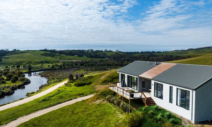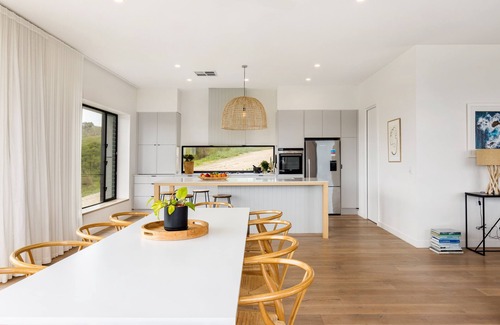 A spacious and fully equipped kitchen makes preparing meals a breeze, with two fridges, two ovens and all the tools you’ll need to whip up a storm. The large dining and lounge areas ensure that friends and family have room to unwind and relax. What makes these spaces even more special are the huge glass windows which frame it, and offer panoramic views across rolling hills, winding Middle River and glistening Snelling Beach.