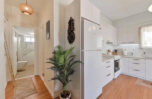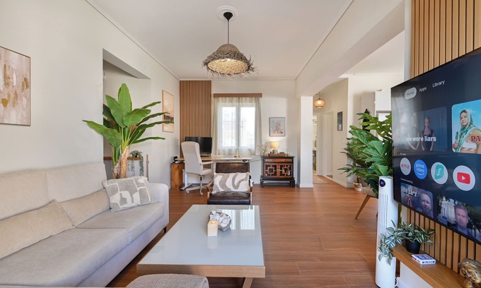 Newly renovated 65sqm Boca-style penthouse in a prime spot—1 min from Preveza’s waterfront promenade, beach clubs, top restaurants, and shops. Sleeps 3 with a large bed and custom-built couch. The private sea-view terrace is a tropical sanctuary with Jacuzzi, ambient lighting, lounge seating, hammock, and wall fan. Includes full kitchen, modern bathroom, fiber internet, elevator, free parking, air conditioning, keyless entry, 4K TVs, and 2 workspaces—one with large automated standing desk.