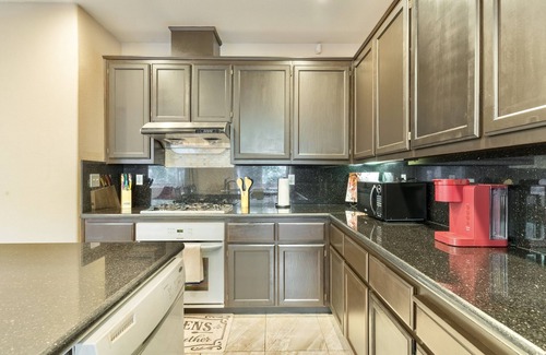 Recently upgraded and beautifully furnished throughout, this private three-bedroom home features an open floor plan with modern kitchen, counter-height seating, dining area, dedicated workspace, and living room with 58” Smart TV.