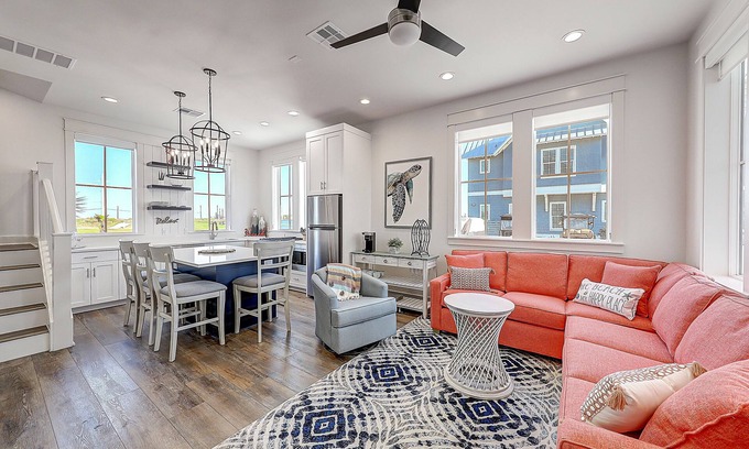 Start every day with a delicious breakfast prepared in the well-appointed kitchen, complete with all major appliances, including a dishwasher and a Keurig coffee maker for no-fuss coffee. Then, grab your favorite towel and make your way to one of the resort's two outdoor pools for a refreshing splash, both of which are equipped with cabanas and bars. After a relaxing swim, head back to your personal oasis. Reflect on the day's adventures at the kitchen island while the group chef whips up a feast for everyone to enjoy. Afterward, retreat to the inviting sectional and stream the newest episode of your favorite series on the smart TV. The front porch offers a cozy place to unwind with two rocking chairs and a small bistro table for two.