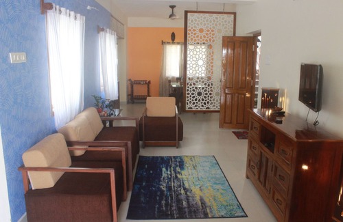 Enjoy the luxury of big space once you enter and the small cozy corners aesthetically created for giving guests a unique experience .The study table with a collection of books from different genres shall add to your relaxed stay. The dining area with teak wood table and chairs is a place to enjoy a hearty meal and make memories with family & friends. The open terrace with plants and pleasant breeze will be the place you will love a lot.The sitting space outside the bedrooms are beautifully made to spend time with friend & listen to music .