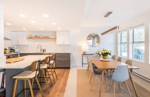 The kitchen is equipped with an oven, stove, dishwasher, microwave, fridge/freezer, and common small appliances. Sugar, common spices, and cooking oil are provided. Enjoy a hearty breakfast at the kitchen bar stools or dining table before hitting the mountain. Brand new appliances ensure a seamless cooking experience for all.