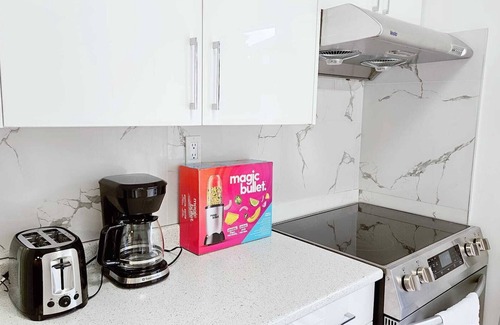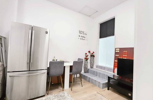 4 Bedrooms, 2.5 Baths: Enter the main suite to find a spacious layout with a private front door entrance. The main floor features a cozy living room with a 65'' smart TV (no cable), an electric fireplace, and a comfortable couch. The dining room with seating arrangement for about 10 people connects seamlessly to the kitchen, equipped with a gas stove, dishwasher, and a range of cookware. Adjacent to the kitchen is a powder room and a king-size bedroom with its own closet and dresser.