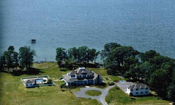 Deep Neck Point is a very private luxury waterfront retreat able to comfortably accommodate up to 12 adults. Located on a private 60 acre peninsula that reaches out into a mile-wide stretch of Broad Creek, the 8,000 square foot house is surrounded by 270 ° of water. The property, which was built in 2003, features a large in-ground pool, a 150 foot dock with 4 ft of water at the end of the dock, a tennis court, a volley ball court, a full basket ball court, a 200 foot zip line over a marsh, a game room with a pool table, a ping pong table, a fire pit with seating for 12, and a small kids playground.