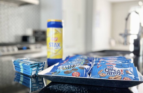 • stove, oven, dishwasher, coffee maker, snacks, spices, oil/vinegar, coffee essentials, pots/pans, utensils, plates, bowls, mugs, glasses, foils, clear wrap, parchment paper, garbage bags, sponges, paper towels and extras.