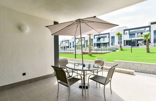 This beautiful apartment in the complex "Oasis Beach IX" in Punta Prima is equipped with all the comforts you need for a pleasant stay. The unit, completed in 2017, has a spacious living room, 2 bedrooms, 2 bathrooms - one of them en suite, an open, fully equipped kitchen and a terrace adjacent to a small plot in front of the entrance. A grill and garden furniture is also available, so that you can enjoy the evenings in a quiet atmosphere with plenty of space for children.