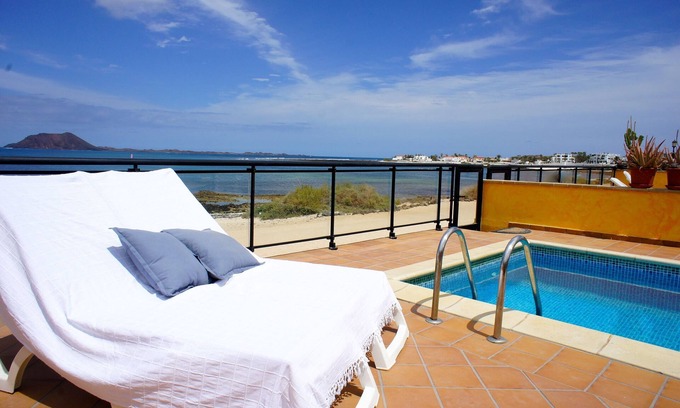 Welcome to Fuerteventura Villa Pax! This beautiful renovated 5 star vacation rental home is on one of the best seafront locations in Corralejo with spectacular ocean views of the islands of Lanzarote and Isla de Los Lobos and direct access to a wonderful beach. You don't need a car - it is all on the doorstep. With only a five minute walk to 4 grocery stores, many restaurants and the main street of Corralejo plus the famous dunes national seashore. The villa is ideally situated for all to enjoy and yet it's still quiet at night.
