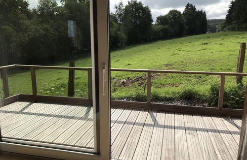 Ideally located in the middle of fields and on the edge of the forest, in the charming village of Roumont in the heart of the Deux Ourthes nature park, this chalet luxuriously furnished in 2016 comfortably accommodates 4 people.