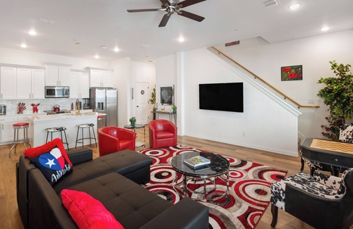 NEW! Perfect for a STAYcation, game, city escape, or special event, breathtaking views await you from the rooftop of this luxurious condo, in the heart of Arlington! Enjoy a fully equipped gourmet kitchen and 2 King bedrooms w ensuite bathrooms. This home provides modern lux furnishings, smart tv's in every room, Wifi, washer/dryer, 2car garage, light workout gear, adult sized arcade game, work stations, bathrobes, slippers, eye masks, and upgraded upscale amenities.