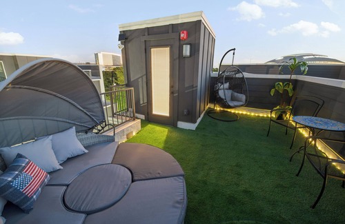 A graceful spiral staircase leads you to a private rooftop sanctuary, where you can experience breathtaking views of the Arlington skyline. From your perch on the top floor, you will be amazed by the stunning panoramic views of the city skyline, which includes the iconic AT&T Stadium and Globe Life Field. This rooftop patio, the crowning glory of your condo, offers you a unique place to relax and enjoy the lights of the city. With patio seating and a canopied moonbed, you have the option to fully relax and enjoy the ambiance of the city from the comfort of your own private space. With each level of the condo, you'll experience a new level of luxury and escape.