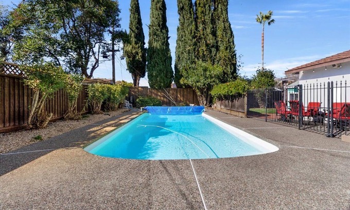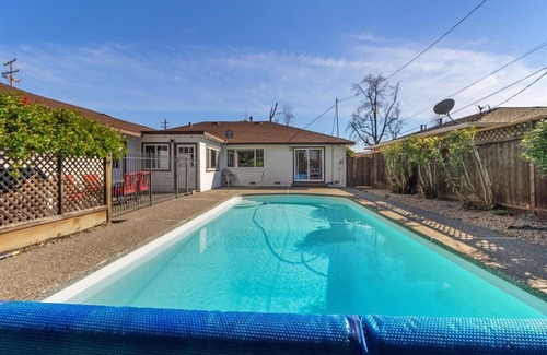 Looking for a Resort Vacation? Look no further. You'll love this beautiful furnished and modern 4BR/2BA home WITH large inground POOL!! From the plush furniture, comfy beds and art deco to the completely upgraded modern amenities you will feel right at home at this beautiful home with landscaped garden and LARGE in-ground pool. 5 SMART TVs with TVs in every bedroom. The home can comfortably sleep 8 adults. 4 Queen beds plus a 1 Queen Sleeper pull out couch. The home is centrally located in the heart of Silicon Valley and just minutes from downtown San Jose. Family and business friendly. Fully equipped kitchen. Fast WiFi, Central Heating and AC.