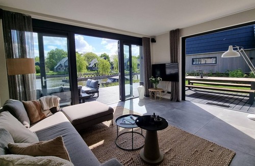 This luxurious holiday home with its own jetty in Balk, Frisian, is very suitable for holidays with the family. The house is located on a small-scale villa park with a direct connection to the Frisian Slotermeer. The water villa has a spacious living room with a comfortable seating area, a smart TV and a spacious dining table. The furnishings are very modern. The villa has a downstairs bedroom with an ensuite bathroom. Upstairs there are 3 bedrooms, 1 with an ensuite bathroom and a separate bathroom. So a lot of luxury and privacy. Balk, located in the Frisian Lake District, is characterized by its historic center located on the Luts River, part of the Eleven Cities Route. You can shop extensively along the canal or sit at one of the cozy terraces. The unique villages along the Elfstedentocht route are also definitely worth a visit. The open kitchen is part of the living room and is equipped with luxury appliances. Through the French doors in the living room you can easily reach the garden with a lovely terrace on the water.