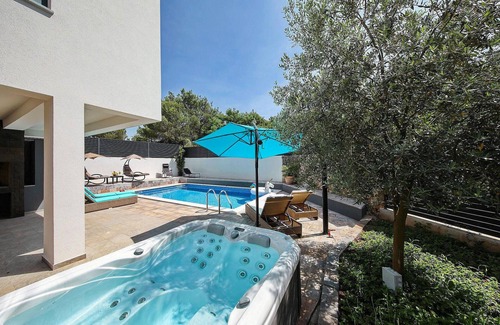This luxurious villa Mara provides accommodation for a total of 6+2 guests in 3 comfortable bedrooms and 3 bathrooms equipped with shower cabins. Each bedroom features a SAT-TV. One of the bedrooms is also equipped a massage bathtub, adding to the luxurious feel of the interior. On the ground floor there is a fully equipped kitchen with a dining room and a living room for family gatherings or relaxing with friends, equipped with SAT-TV and Surround system. The yard, fully fenced by grove and stone, features a beautiful, heated pool (35m2) surrounded by 8 sun loungers. The offer of the house includes a children's playground for the youngest guests, an outdoor grill as well as an outdoor jacuzzi and sauna for your maximum comfort. Private parking under video surveillance for three cars is also included in the luxurious offer of the villa.