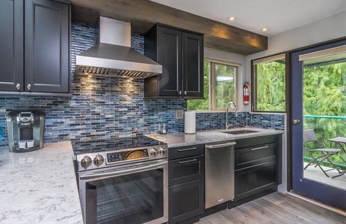 Starting with a well stocked chef's kitchen, quartz counters, oversize fridge with ice maker and water, built in stainless appliances, and induction range. Ocean and garden views from the kitchen with a balcony to enjoy the gardens.