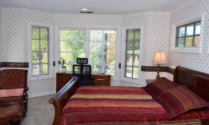 Privacy in Entry –after parking on the gated circular driveway, you can enter the suite without passing through any bedrooms, the kitchen, or other rooms. Enter the front door, take the stairway on the left, and as you reach the second floor, the suite is directly in front of you.