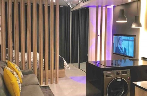 The kitchenette is equipped with all the essential appliances, cookware and utensils for cooking and dining. Also, there are a washing machine and an iron. The space is contemporary furnished, including bar stool for dining, cozy sofa and cabled TV for chilling out, king sized bed for your comfort.