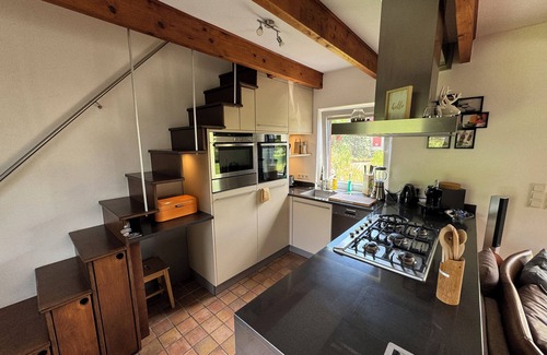 The ground floor features a large, luxurious, new bathroom with whirlpool, high-quality and large-scale, walk-in shower, built-in furniture. The new kitchen includes high-end devices, such as a large-capacity Miele gas cooktop. The kitchen is equipped with dishwasher, oven, toaster, microwave oven, Wok, pots, pans, kettle etc. All appliances are new or like new. The ground floor consists of a large living, dining area, which integrates the kitchen. There is a large dining table with six seats. To linger there is a beautiful fireplace and a leather sofa in the living area there is a TV. Directly from the dining area is accessed by large doors on one or both terraces in the garden.