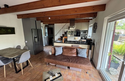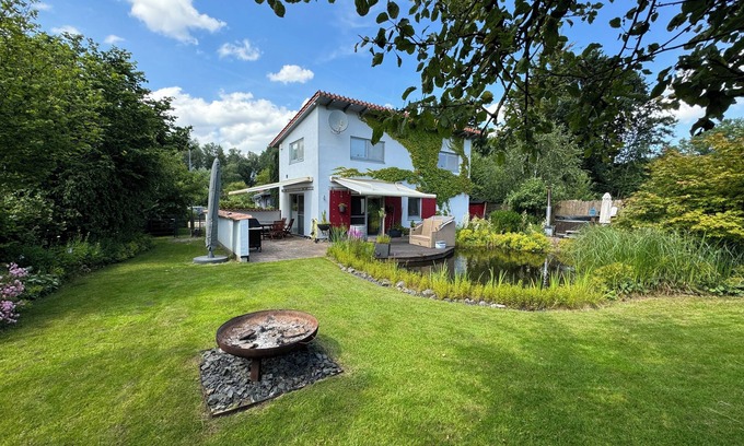 We rent a luxury holiday home with about 100 m² living space, which includes one large and one smaller bedroom with twin beds upstairs. One bedroom is equipped with a television. There is a large, stocked bookshelf. Directly from the bedrooms one can access the large garden with a fish pond and watch the channel. A large natural refuge is in sight, there abide herons, cormorants and many rare ducks and geese, which can be observed. The bedrooms are provided with sun protection systems and mosquito protection on the windows to ensure peaceful nights.