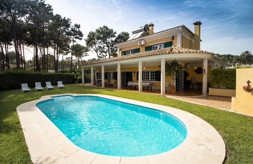 Beautiful romantic and luxurious villa, on the golf of Aroeira, in a nature reserve, 25km from the center of Lisbon, only 600m from the beach. Aroeira is the largest golf complex in the region, it covers 350ha with thousands of pines and 13 lakes. Aroeira has 2 18-hole championship courses, 1 golf school, 1 welcoming club house with restaurant, snack bar, bar, golf shop, tropical pool, 4 tennis courts, playground, and small shopping center. The complex is closed, with a concierge at the entrance, and despite the fact that the place is peaceful, there is 1 security service 24/24. All these characteristics make Aroeira a choice place for holidays with family or friends to enjoy golf, beach, diving, beautiful shared tropical pool, tennis, trekking, cycling, leisure and contact with nature without forgetting to as much to enjoy the life of beautiful capital day and night. Kennel available for well behaved animals.