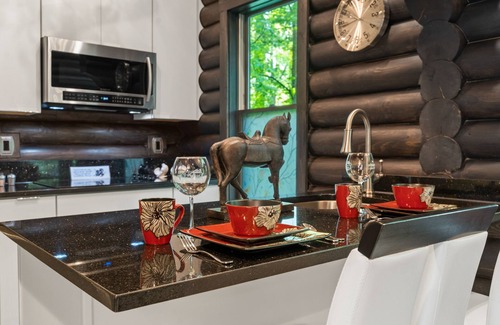 The Zen Garden is a 5 Star property is a delightful mix of log construction and eclectic design. The first thing you will notice is the WATERFALL in the beautiful gardens leading up to the decks. Step inside onto the high gloss beautiful marble like flooring throughout. The trapezoid style windows fully open up the gable end for a the large window wall that gives you a direct view of the outdoors and lovely gardens, trees and sky all the way through the ravine and to the water. The morning sun is especially beautiful streaming through the windows and simmering off the ceilings throughout. The Master Bedroom with king bed and en-suite is spacious and has a shower with a rain feature. The pebble shower floor flows freely through the bathroom and under the free standing angular tub and double vanity with beautiful mirrors. You have the feeling of a cobble stone path winding aimlessly. The fully appointed Kitchen has granite counter tops and a stainless sink. The black stainless full size appliances slip seamlessly into the decor. The modern comforts and amenities are all included. The loft expands for a second bedroom and bathroom so that you can enjoy with friends. The décor is extended to this space with no lack of detail. There is an additional TV. A silver loveseat and side chair round out the living room in the loft. It is a complete additional space for a second couple or friends travelling together. The 4 person hot tub, for your relaxing pleasure after a bike ride or hike or for no reason at all, is under a covered outdoor space. Enjoy it rain or shine. High speed Wi Fi make catching up with business or staying in touch with social media easy. Big screen Roku smart TVs in both bedrooms and great room. (We hope you abandon these habits and truly disconnect for a rejuvenating experience.) The Zen Gardens has 1,250 sq. ft. of room to stretch out and enjoy your quiet time.