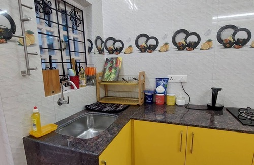 • Kitchen is fully equipped, has cabinets, fridge/freezer, Automatic washing machine, electric kettle, microwave oven, toaster, cooking pans and the entire cutlery required for 4 people.