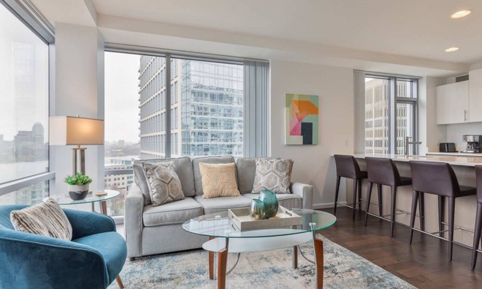 A gorgeous and modern 1,084 sq. ft. corner unit apartment with views of the Charles River, a breakfast bar, and oversized windows.