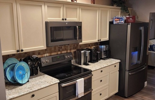 The spacious single-floor, ranch-style home features no stairs, a large great room with a fireplace and 85" TV, and a formal dining room with seating for up to 12. Guests have access to the entire house, except the garage, with driveway space for 4-5 cars. The home includes a second master suite with a queen murphy bed and a private bath that is wheelchair accessible with grab bars in the shower, perfect for additional privacy and comfort.