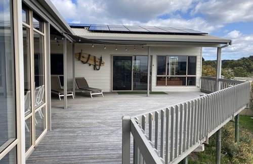 You’ll feel right at home the moment you step onto the huge deck with 180 degree panoramic sea views, overlooking the beautiful Island Beach. Inside the house, the interior boasting leather lounges, a panoramic front sunroom with massive windows frame expansive views of the surrounding beach scenery and creating a dazzling backdrop for your trip.