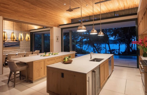 A serene water feature runs throughout the main social level, filling the space with calming soundscapes and occasionally attracting visits from deer and vibrant tropical birds. Spread across three levels, Villa Jade offers exceptional privacy and a clear distinction between social and private areas—ideal for multiple families or groups, with each floor offering its own sense of seclusion. An elevator ensures seamless access throughout the home.