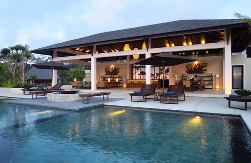The open pitch living pavilion of 100 square meters is open to cool breezes on three sides and comprises a luxurious lounge, an elegant dining room with a natural wood block dining table and a long bar, behind which is a fully equipped kitchen. The living area provides a luxurious feel with marble flooring, Palimanan feature walls and all bespoke designer furniture and lamps. The outsize central bar counter is a natural, informal meeting place and watering hole for guests. The eight-panel folding door separating the living space and the kitchen when closed presents a series of full height bronze mirrors in which mountain views and glorious sunsets across the pool deck are reflected back into the living space.