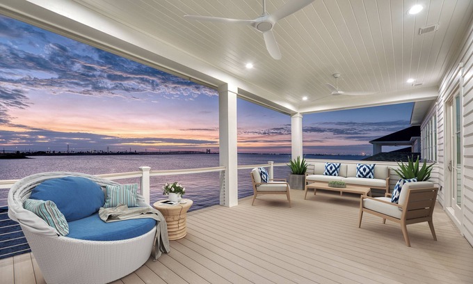 Consider this marvelous waterfront house your home away from home while you visit Galveston Island. Our place is equipped for both long or short stays to make your trip one to remember. With 7 bedrooms including 2 king beds, 3 queen beds, and 3 bunk beds, there's plenty of space for up to 18 guests. Relax in 5 luxurious spa like bathrooms. Enjoy an open concept kitchen and living area that is perfect for entertaining and a fully stocked kitchen ideal for a chef. Bring the outdoors in with 2 sliding glass doors. Enjoy 1,400 sq ft of porches. and backyard amenities that include an infinity edge pool, hot tub, helicopter pad, dock for fishing and white sand beach with washer boards and other activities. Parking for 8 cars under house and driveway. In the evening enjoy a cocktail with the best sunset views on Galveston Island! 5 minutes to The Strand, 5 minutes to the beach!