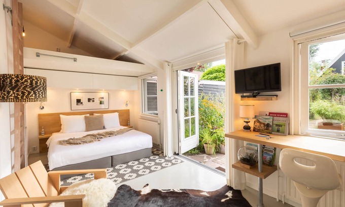 The luxurious Bed and Breakfast for two persons is situated in a private cottage located in a romantic garden and consists of a living / sleeping area that is particularly stylishly furnished with a private bathroom ensuite. Hotel safe and closed covered bicycle parking.