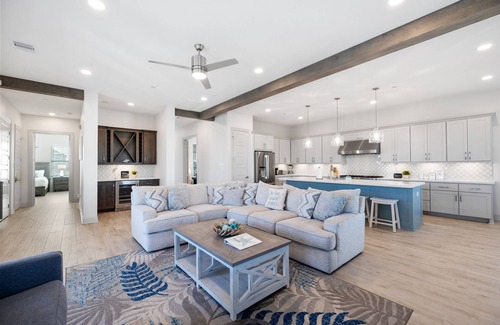 This five-bedroom Galveston vacation home accommodates up to 16 guests (maximum 10 adults) with ease, offering an expansive, open-concept living space designed for relaxation and entertainment. An in-home elevator provides seamless convenience for transporting luggage and groceries.