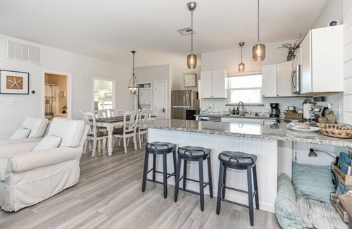 This upscale space has been designed to provide a calm and relaxing beach retreat. Everything from the swinging chairs and patio furniture to the location have been selected to provide you with the ultimate resort experience. The kitchen has been stocked with everything you need to cook all your meals at home if desired, included a full set of pots and pan, bake ware, blender, crock pot, mixing bowls, hand mixer, serving dishes, and extra dishes and cups. A cold/hot filtered water dispenser will provide you with all the drinking water you need.