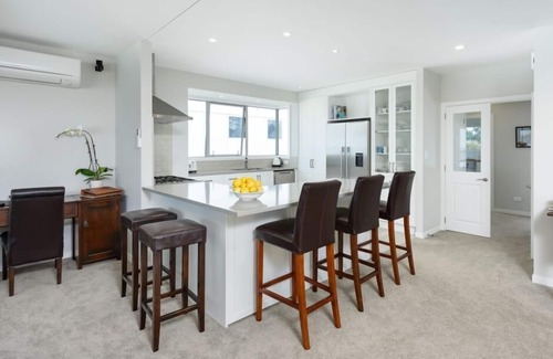 In this beautifully appointed home, you can enjoy the BBQ on the sheltered ocean side balcony for the summer months or the gas fire for the winter months. Set down a private driveway you have private access from the deck to the beach and can see the flags at the Omanu Surf club from the lounge.
