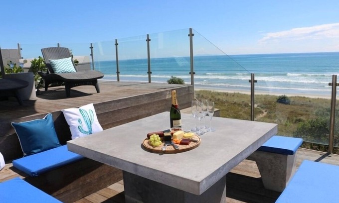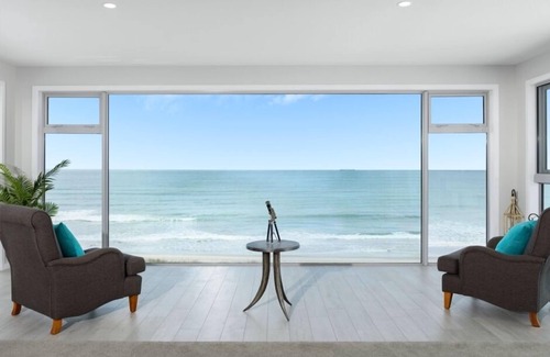 This luxury five bedroom, three bathroom home sits on a full sized section on Mount Maunganui's premium stretch of beachfront land between the end of Marine Parade and the Omanu Surf Club. It has spectacular panoramic views from both floors which span from the main Mount beach to Maketu.