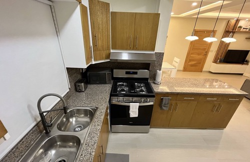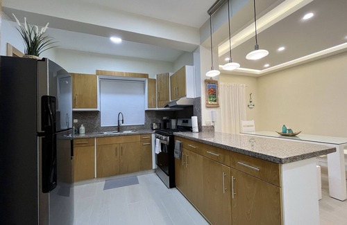 This luxury apartment in only 5 min from white sands beaches, best restaurants, and embarcadero to Saona island in Bayahibe. It has 5 rooms including 2 bedrooms with new ACs, 1 bathroom, laundry room, central hot water, and living room, dining room and kitchen. Fully furnished with 50” TV, free WIFI.