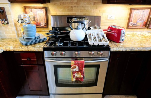 • Modern full size kitchen with granite counter tops and stainless steel major appliances.