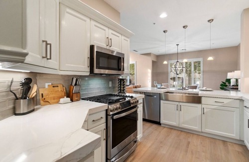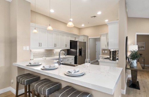 This 2 bedroom, 2-1/2 bath condo is beautifully renovated, with two patios for relaxed outdoor living. Most of the main living area is on the ground level with bedrooms on the second floor. The condo is surrounded by miles of paved walking paths, and is just minutes to shopping, grocery and dining. A two story villa with large master bedroom, large walk-in closet, large soaking tub, kitchen, living room, dining room, office/den, spare bedroom, attached 2 car garage and laundry room with full-size washer and dryer. Living room has 20' vaulted ceilings, cozy gas fireplace, sectional couch and two swivel glider chairs. Ground floor covered patio has comfortable cushioned furniture and views of trees and wildlife. You will see quail, doves and sometimes great horned owls as you relax with a glass of wine or your morning coffee. The master bedroom with en-suite includes a balcony for taking in the evening sunsets. Kitchen includes gas stove, microwave, dishwasher, refrigerator w/ ice and water dispenser, and new beautiful quartz countertops with snack bar. A coffee maker, toaster, and most small appliances and cooking utensils are provided. The Dining area is beautifully appointed. The Den/office is a bonus room, complete with desk, chair, and task light for those that need to catch up on e-mails or work while away. WiFi is included in the rental. The living room and master bed room include 50" smart TV's. The condo has everything you need to enjoy your time in the Valley of the Sun.