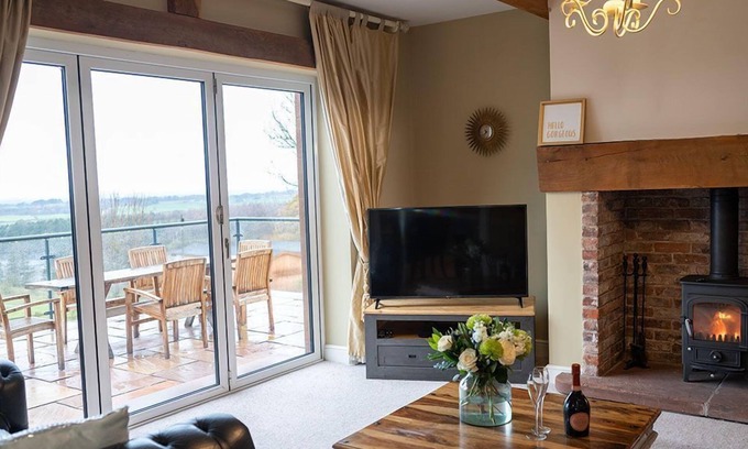 Attached to the main farmhouse, the cottage has bi-folding doors that open up to a glass enclosed balcony with hot tub, bringing the stunning views of the reservoir into the open plan living room.