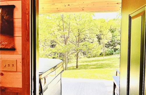 Caveside features an Amish made King size bed, with a new memory mattress. Walk out the back door to the private, covered back porch including seating and a hot tub. The outdoor area include a new gas grill and a gas fire pit area.