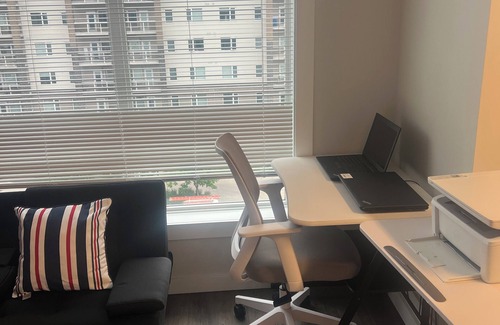 Contemporary, luxurious, and cosy, this 6th floor, 1 bedroom condo , a private balcony, a 55” inch smart TV, Wi-Fi and in-suite laundry.