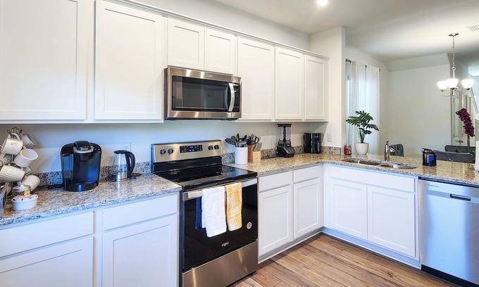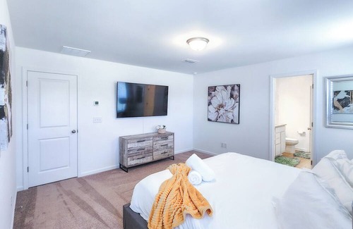 This cozy queen bedroom features a comfortable bed, a 65+ inch TV, and a walk-in closet. It's well-appointed and ideal for guests who appreciate a blend of convenience and comfort.Nestled in Charlotte, this delightful house is the perfect retreat for guests seeking an excellent vacation experience. With 4 bedrooms, including 2 king beds and 2 queen beds, there's plenty of space for everyone to relax and unwind.