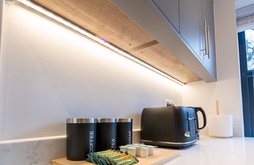 The fully-equipped kitchen boasts of white goods soft-close cupboards and a sleek white marble worktop. You'll find an array of kitchen essentials in the drawers.