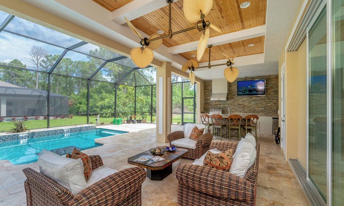 The true highlight of this home is the outdoor living space. Giant lanai with summer kitchen area, seating area, bar and TV. Direct access to guest bathroom.