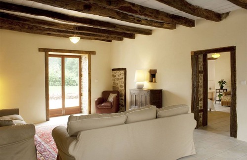Stone walls have been exposed revealing original candle recesses and oak beams used in the construction of the cottage. Modern comfy sofas (including a king size bed settee) and restored furniture from the region compliment each other to create a relaxing living area. WiFi, numerous board games and TV with a DVD player are provided.