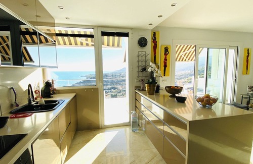 You live in an approximately 200 sqm large, detached villa in the Sierra de Irta nature reserve on a mountain 65 m above sea level. The rooms (living/dining room with open American kitchen, bedrooms all have sea views, 2 shower bathrooms also have sea views, as well as views of the mountains and the monastery of San Antoni.
