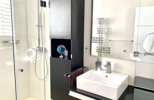 The master bedroom with its 2x2 m large, back-friendly comfort bed, air conditioning and modern en suite bathroom is on a separate floor and also offers you a breathtaking sea view from the bed.