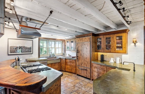 The chef’s built gourmet kitchen has Wolf stove, Sub-Zero refrigerator, prep station, wine fridge and high-end cookware to make and serve gourmet meals.