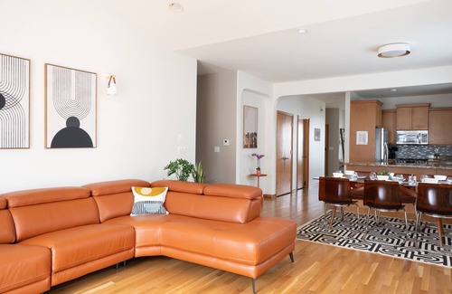 The space boasts high-quality bedding and towels, a modern leather sectional